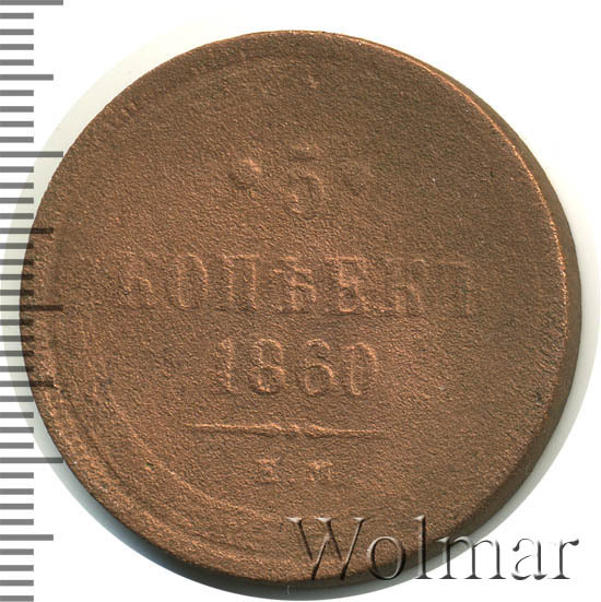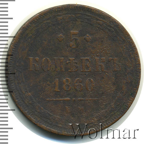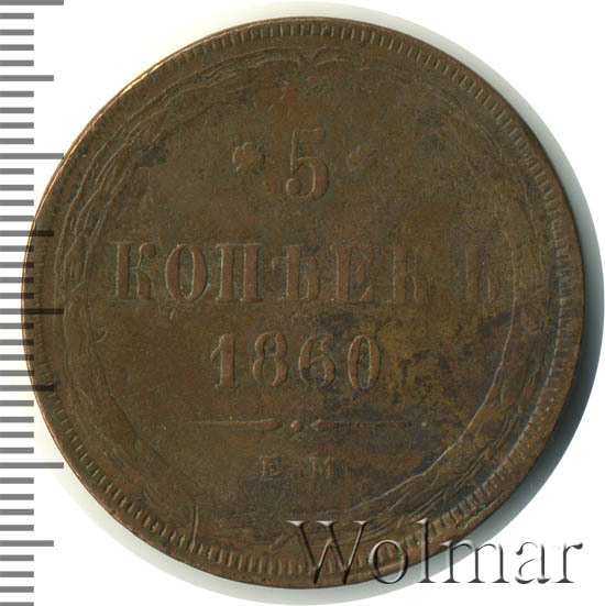 В центре указан номинал «5», ограниченный с обеих сторон цветочными розетками. Под цифрой номинала — слово "КОПЕЕК", под ним год выпуска монеты «1860.». Ниже, расположен декоративный разделитель в виде двух фигурных линий и небольшой точки между ними. Под разделителем обозначение монетного двора «Е.М.».