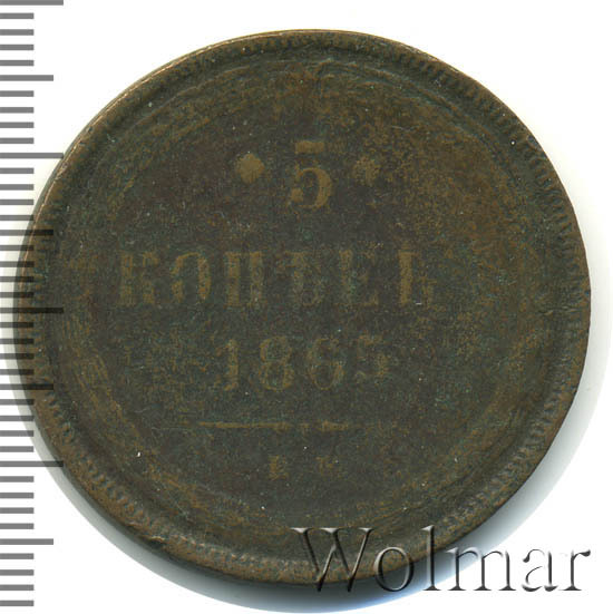 В центре указан номинал «5», ограниченный с обеих сторон цветочными розетками. Под цифрой номинала слово — "КОПЕЕК", под ним год выпуска монеты «1865.». Ниже, расположен декоративный разделитель в виде двух фигурных линий и небольшой точки между ними. Под разделителем обозначение монетного двора «Е.М.».