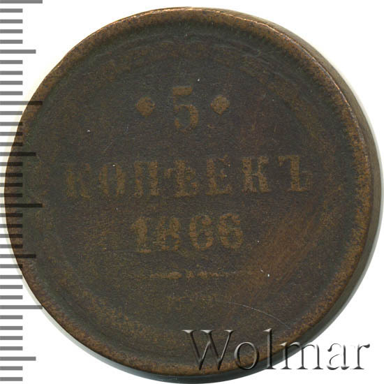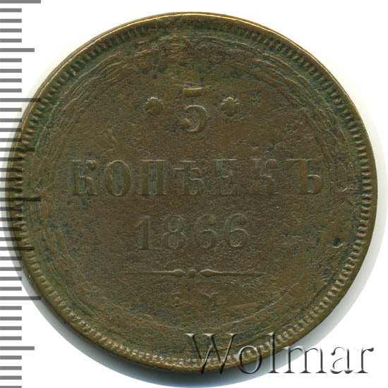 В центре указан номинал «5», ограниченный с обеих сторон цветочными розетками. Под цифрой номинала слово — "КОПЕЕК", под ним год выпуска монеты «1866.». Ниже, расположен декоративный разделитель в виде двух фигурных линий и небольшой точки между ними. Под разделителем обозначение монетного двора «Е.М.».