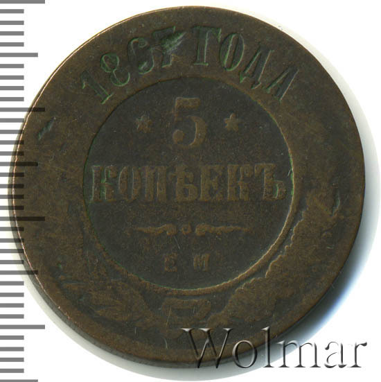 В центре указан номинал «5», ограниченный с обеих сторон звездочками. Под цифрой номинала слово — "КОПЕЕК". Ниже, расположен декоративный разделитель в виде двух изогнутых линий и небольшой окружности между ними. Под линиями обозначение монетного двора «Е.М.». Центральная часть отделена от остального изображения, окружностью в виде точек. В верхней части по кругу углубленная надпись: "1867 ГОДА". Вдоль канта изображен венок из лавровой и дубовой ветви, которые в нижней части перевязаны лентой на узел бантом.