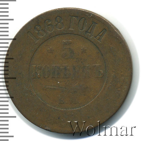 В центре указан номинал «5», ограниченный с обеих сторон звездочками. Под цифрой номинала слово — "КОПЕЕК". Ниже, расположен декоративный разделитель в виде двух изогнутых линий и небольшой окружности между ними. Под линиями обозначение монетного двора «Е.М.». Центральная часть отделена от остального изображения, окружностью в виде точек. В верхней части по кругу углубленная надпись: "1868 ГОДА". Вдоль канта изображен венок из лавровой и дубовой ветви, которые в нижней части перевязаны лентой на узел бантом.