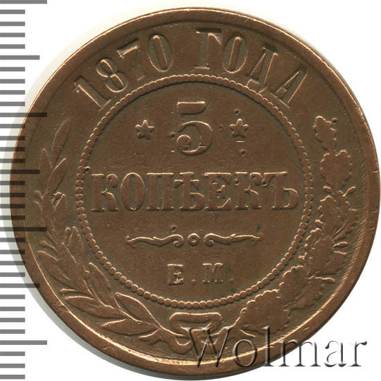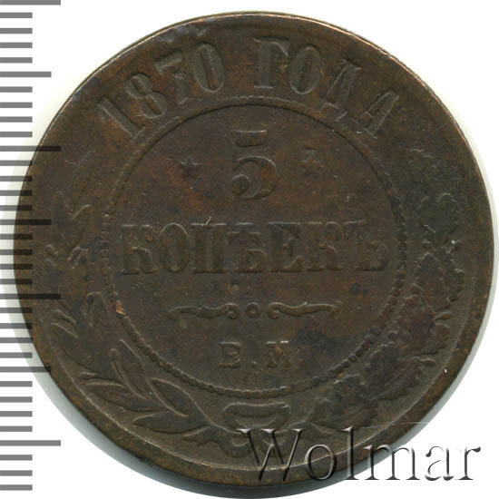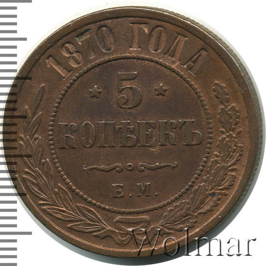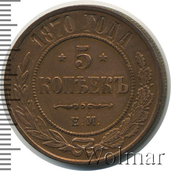 В центре указан номинал «5», ограниченный с обеих сторон звездочками. Под цифрой номинала слово — "КОПЕЕК". Ниже, расположен декоративный разделитель в виде двух изогнутых линий и небольшой окружности между ними. Под линиями обозначение монетного двора «Е.М.». Центральная часть отделена от остального изображения, окружностью в виде точек. В верхней части по кругу углубленная надпись: "1870 ГОДА". Вдоль канта изображен венок из лавровой и дубовой ветви, которые в нижней части перевязаны лентой на узел бантом.