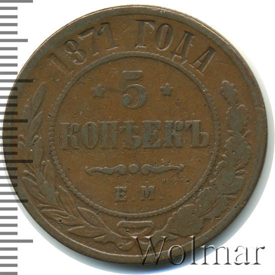 В центре указан номинал «5», ограниченный с обеих сторон звездочками. Под цифрой номинала слово — "КОПЕЕК". Ниже, расположен декоративный разделитель в виде двух изогнутых линий и небольшой окружности между ними. Под линиями обозначение монетного двора «Е.М.». Центральная часть отделена от остального изображения, окружностью в виде точек. В верхней части по кругу углубленная надпись: "1871 ГОДА". Вдоль канта изображен венок из лавровой и дубовой ветви, которые в нижней части перевязаны лентой на узел бантом.