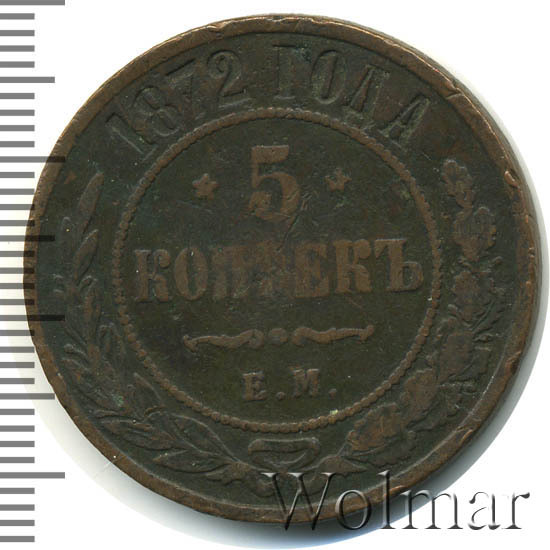 В центре указан номинал «5», ограниченный с обеих сторон звездочками. Под цифрой номинала слово — "КОПЕЕК". Ниже, расположен декоративный разделитель в виде двух изогнутых линий и небольшой окружности между ними. Под линиями обозначение монетного двора «Е.М.». Центральная часть отделена от остального изображения, окружностью в виде точек. В верхней части по кругу углубленная надпись: "1872 ГОДА". Вдоль канта изображен венок из лавровой и дубовой ветви, которые в нижней части перевязаны лентой на узел бантом.