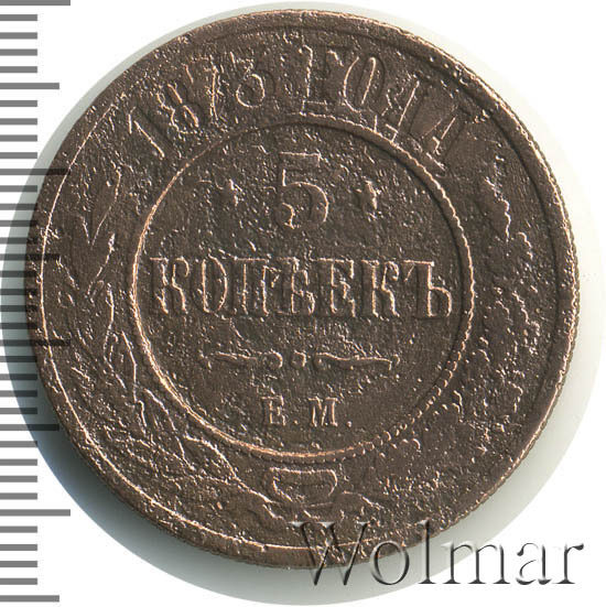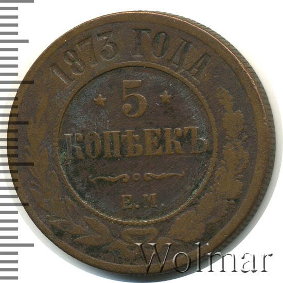 В центре указан номинал «5», ограниченный с обеих сторон звездочками. Под цифрой номинала слово — "КОПЕЕК". Ниже, расположен декоративный разделитель в виде двух изогнутых линий и небольшой окружности между ними. Под линиями обозначение монетного двора «Е.М.». Центральная часть отделена от остального изображения, окружностью в виде точек. В верхней части по кругу углубленная надпись: "1873 ГОДА". Вдоль канта изображен венок из лавровой и дубовой ветви, которые в нижней части перевязаны лентой на узел бантом.
