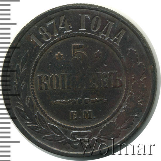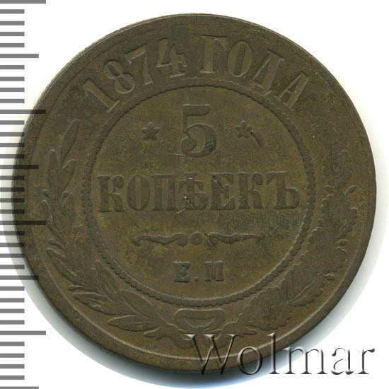 В центре указан номинал «5», ограниченный с обеих сторон звездочками. Под цифрой номинала слово — "КОПЕЕК". Ниже, расположен декоративный разделитель в виде двух изогнутых линий и небольшой окружности между ними. Под линиями обозначение монетного двора «Е.М.». Центральная часть отделена от остального изображения, окружностью в виде точек. В верхней части по кругу углубленная надпись: "1874 ГОДА". Вдоль канта изображен венок из лавровой и дубовой ветви, которые в нижней части перевязаны лентой на узел бантом.