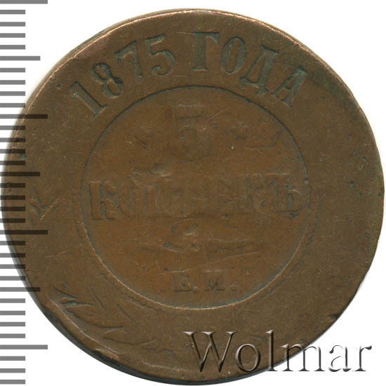 в центре указан номинал «5», ограниченный с обеих сторон звездочками. Под цифрой номинала слово — "КОПЕЕК". Ниже, расположен декоративный разделитель в виде двух изогнутых линий и небольшой окружности между ними. Под линиями обозначение монетного двора «Е.М.». Центральная часть отделена от остального изображения, окружностью в виде точек. В верхней части по кругу углубленная надпись: "1875 ГОДА". Вдоль канта изображен венок из лавровой и дубовой ветви, которые в нижней части перевязаны лентой на узел бантом.