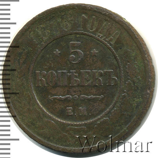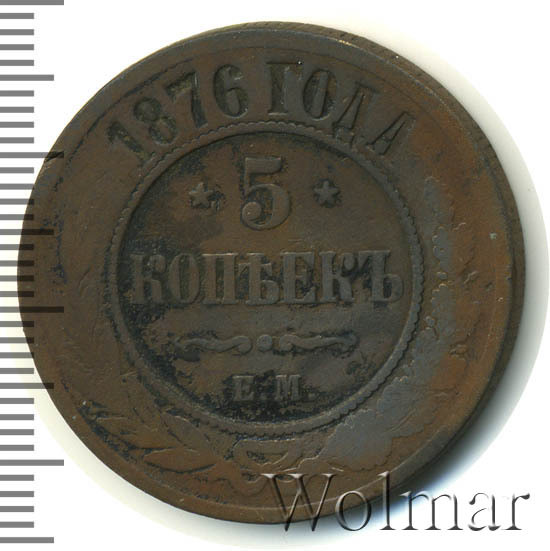 В центре указан номинал «5», ограниченный с обеих сторон звездочками. Под цифрой номинала слово — "КОПЕЕК". Ниже, расположен декоративный разделитель в виде двух изогнутых линий и небольшой окружности между ними. Под линиями обозначение монетного двора «Е.М.». Центральная часть отделена от остального изображения, окружностью в виде точек. В верхней части по кругу углубленная надпись: "1876 ГОДА". Вдоль канта изображен венок из лавровой и дубовой ветви, которые в нижней части перевязаны лентой на узел бантом.