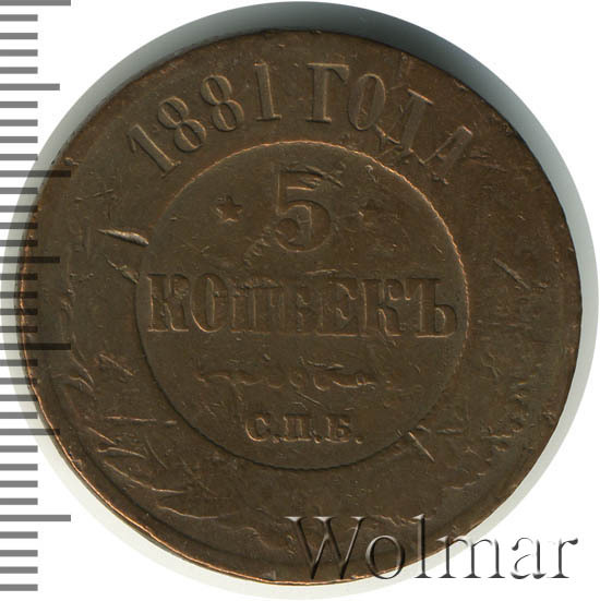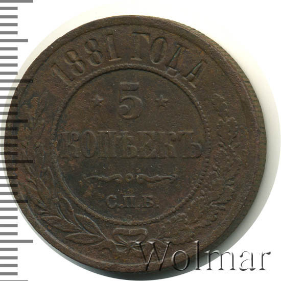 В центре указан номинал - цифра «5», ограниченный с обеих сторон звездочками. Под цифрой номинала слово — "КОПЕЕК". Ниже, расположен декоративный разделитель в виде двух изогнутых линий и небольшой окружности между ними. Под линиями обозначение монетного двора «С.П.Б.». Центральная часть отделена от остального изображения, окружностью в виде точек. В верхней части по кругу углубленная надпись: "1881 ГОДА". Вдоль канта изображен венок из лавровой и дубовой ветви, которые в нижней части перевязаны лентой на узел бантом.