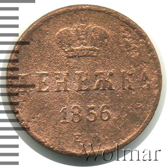 В центе обозначение номинала — слово «ДЕНЕЖКА». Выше номинала - Корона Российской империи. Ниже номинала — год выпуска монеты «1856.» и под годом — обозначение монетного двора буквы «Е.М.».