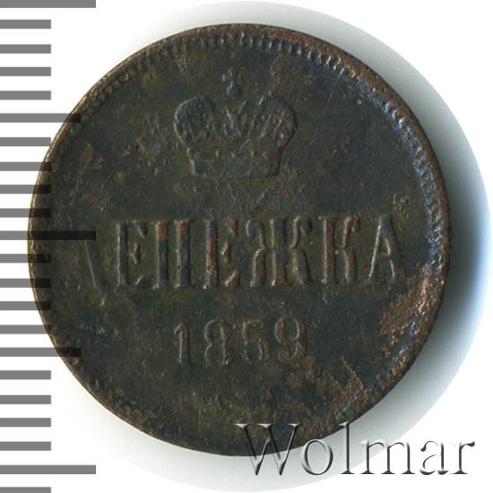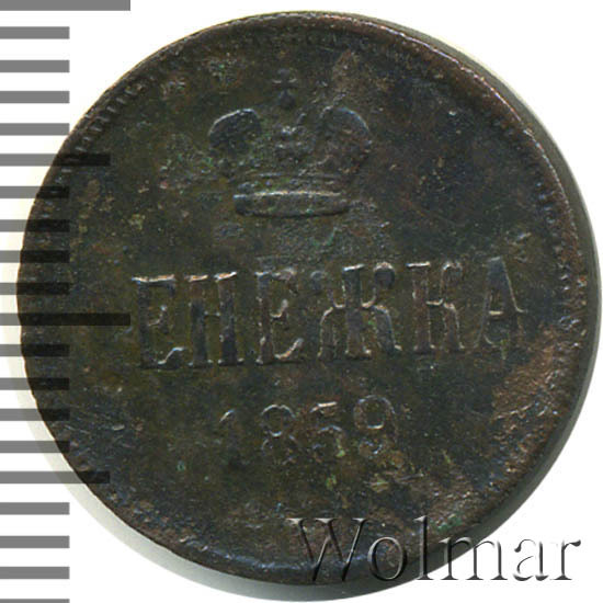Аверс монеты денежка 1859 года ЕМ короны уже