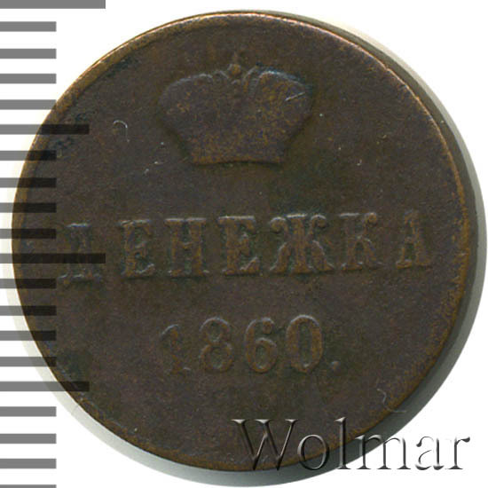В центе обозначение номинала - слово «ДЕНЕЖКА». Выше - Корона Российской империи. Ниже - год выпуска монеты «1860.» и под годом - обозначение монетного двора буквы «В.М.».
