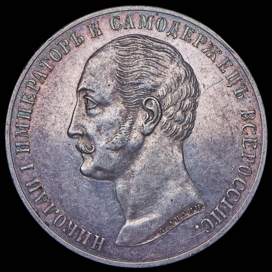 В центре профильный портрет влево императора Николая I. В обрезе шеи подпись медальера - «А. ЛЯЛИН.». Вокруг портрета надпись «НИКОЛАЙ I ИМПЕРАТОРЪ И САМОДЕРЖЕЦЪ ВСЕРОССIИС.».