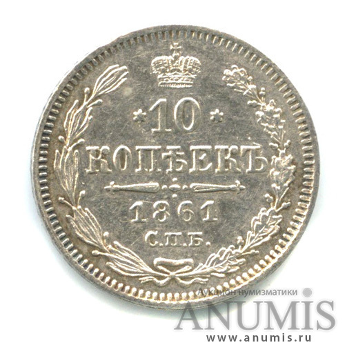В центре указан номинал «10», ограниченный с обеих сторон шестиконечными звездочками. Над цифрой – Корона Российской империи. Под цифрой номинала — слово "КОПЕЕК". Ниже, расположен декоративный разделитель в виде двух разнонаправленных фигурных линий и стилизованным из точек крестом между ними. Под разделителем — дата выпуска монеты «1861». Под цифрой даты — обозначение монетного двора «С.П.Б.». Вдоль канта, не доходя до короны, изображен венок из лавровой и дубовой ветви, которые в нижней части перевязаны лентой на узел бантом. По окружности канта имеются рельефные элементы, выполненные в виде зубцов.