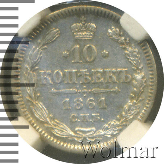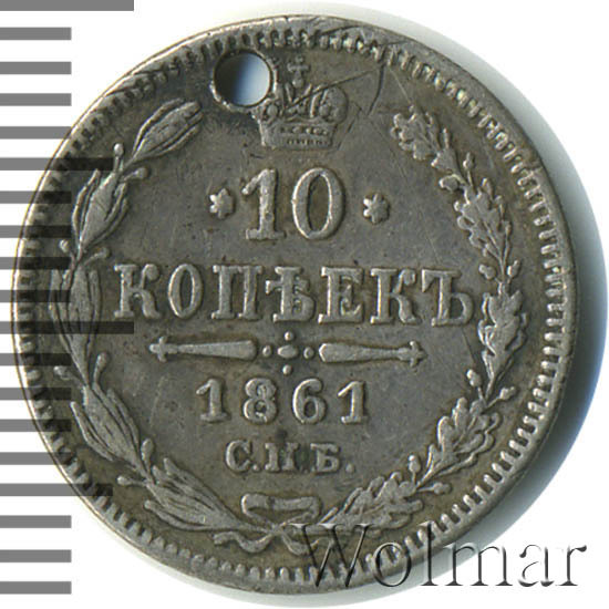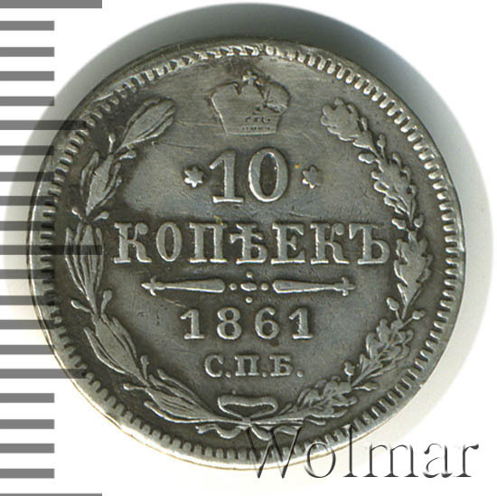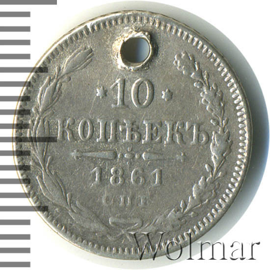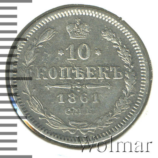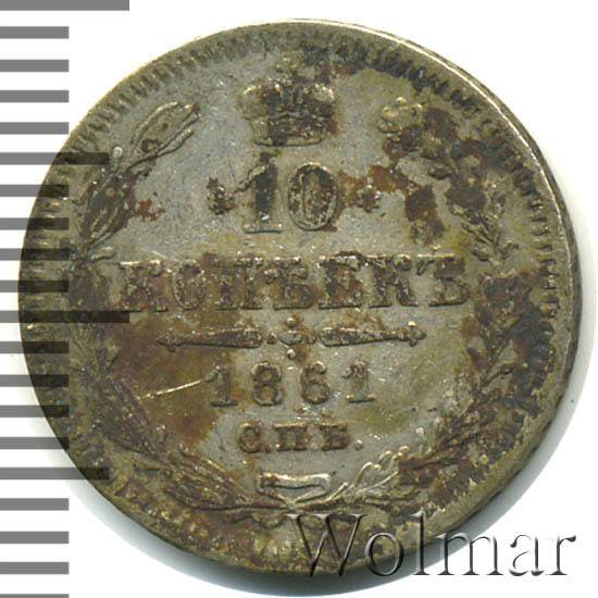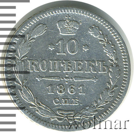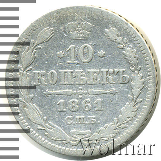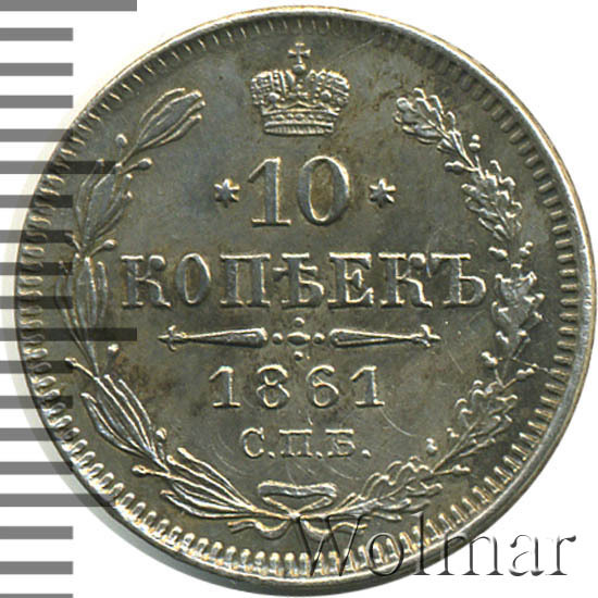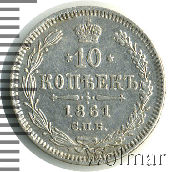 В центре указан номинал «10», ограниченный с обеих сторон шестиконечными звездочками. Над цифрой – Корона Российской империи. Под цифрой номинала — слово "КОПЕЕК". Ниже, расположен декоративный разделитель в виде двух разнонаправленных фигурных линий и стилизованным из точек крестом между ними. Под разделителем — дата выпуска монеты «1861». Под цифрой даты — обозначение монетного двора «С.П.Б.». Вдоль канта, не доходя до короны, изображен венок из лавровой и дубовой ветви, которые в нижней части перевязаны лентой на узел бантом. По окружности канта имеются рельефные элементы, выполненные в виде зубцов.