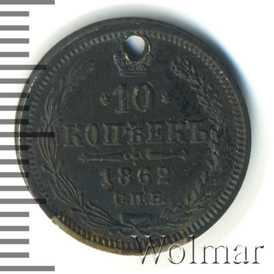 В центре указан номинал «10», ограниченный с обеих сторон шестиконечными звездочками. Над цифрой – Корона Российской империи. Под цифрой номинала — слово "КОПЕЕК". Ниже, расположен декоративный разделитель в виде двух разнонаправленных фигурных линий и стилизованным из точек крестом между ними. Под разделителем — дата выпуска монеты «1862». Под цифрой даты — обозначение монетного двора «С.П.Б.». Вдоль канта, не доходя до короны, изображен венок из лавровой и дубовой ветви, которые в нижней части перевязаны лентой на узел бантом. По окружности канта имеются рельефные элементы, выполненные в виде зубцов.