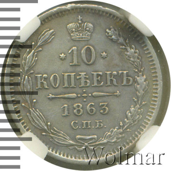 В центре указан номинал «10», ограниченный с обеих сторон шестиконечными звездочками. Над цифрой – Корона Российской империи. Под цифрой номинала — слово "КОПЕЕК". Ниже, расположен декоративный разделитель в виде двух разнонаправленных фигурных линий и стилизованным из точек крестом между ними. Под разделителем — дата выпуска монеты «1863». Под цифрой даты — обозначение монетного двора «С.П.Б.». Вдоль канта, не доходя до короны, изображен венок из лавровой и дубовой ветви, которые в нижней части перевязаны лентой на узел бантом. По окружности канта имеются рельефные элементы, выполненные в виде зубцов.