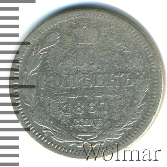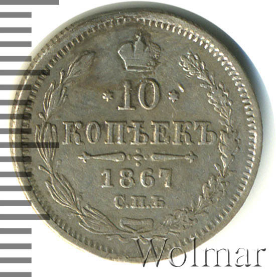 В центре указан номинал - «10», ограниченный с обеих сторон шестиконечными звездочками. Над цифрой – Корона Российской империи. Под цифрой номинала — слово "КОПЕЕК". Ниже, расположен декоративный разделитель в виде двух разнонаправленных фигурных линий и стилизованным из точек крестом между ними. Под разделителем — дата выпуска монеты «1867». Под цифрой даты — обозначение монетного двора «С.П.Б.». Вдоль канта, не доходя до короны, изображен венок из лавровой и дубовой ветви, которые, в нижней части, перевязаны лентой на узел бантом. По окружности канта имеются рельефные элементы, выполненные в виде зубцов.
