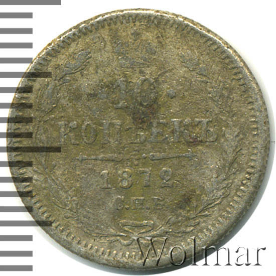 В центре указан номинал - «10», ограниченный с обеих сторон шестиконечными звездочками. Над цифрой – Корона Российской империи. Под цифрой номинала — слово "КОПЕЕК". Ниже, расположен декоративный разделитель в виде двух разнонаправленных фигурных линий и стилизованным из точек крестом между ними. Под разделителем — дата выпуска монеты «1872». Под цифрой даты — обозначение монетного двора «С.П.Б.». Вдоль канта, не доходя до короны, изображен венок из лавровой и дубовой ветви, которые, в нижней части, перевязаны лентой на узел бантом. По окружности канта имеются рельефные элементы, выполненные в виде зубцов.