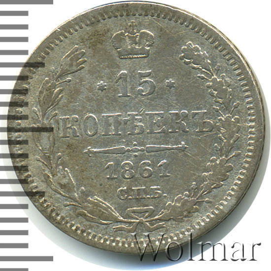Аверс монеты 15 копеек 1861 года СПБ-ФБ
