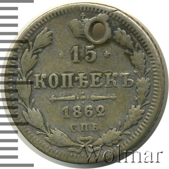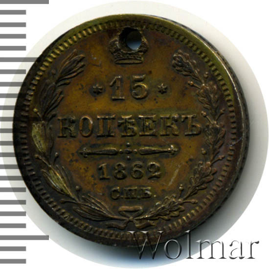 В центре указан номинал «15», ограниченный с обеих сторон шестиконечными звездочками. Над цифрой – Корона Российской империи. Под цифрой номинала — слово "КОПЕЕК". Ниже, расположен декоративный разделитель в виде двух разнонаправленных фигурных линий и стилизованным из точек крестом между ними. Под разделителем — дата выпуска монеты «1862». Под цифрой даты — обозначение монетного двора «С.П.Б.». Вдоль канта, не доходя до короны, изображен венок из лавровой и дубовой ветви, которые в нижней части перевязаны лентой на узел бантом. По окружности канта имеются рельефные элементы, выполненные в виде зубцов.