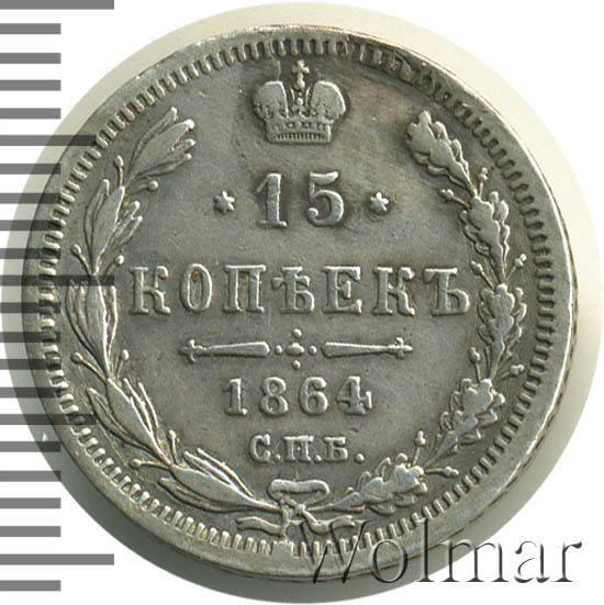 В центре указан номинал «15», ограниченный с обеих сторон шестиконечными звездочками. Над цифрой – Корона Российской империи. Под цифрой номинала — слово "КОПЕЕК". Ниже, расположен декоративный разделитель в виде двух разнонаправленных фигурных линий и стилизованным из точек крестом между ними. Под разделителем — дата выпуска монеты «1864». Под цифрой даты — обозначение монетного двора «С.П.Б.». Вдоль канта, не доходя до короны, изображен венок из лавровой и дубовой ветви, которые в нижней части перевязаны лентой на узел бантом. По окружности канта имеются рельефные элементы, выполненные в виде зубцов.