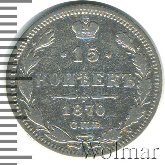 В центре указан номинал - «15», ограниченный с обеих сторон шестиконечными звездочками. Над цифрой – Корона Российской империи. Под цифрой номинала — слово "КОПЕЕК". Ниже, расположен декоративный разделитель в виде двух разнонаправленных фигурных линий и стилизованным из точек крестом между ними. Под разделителем — дата выпуска монеты «1870». Под цифрой даты — обозначение монетного двора «С.П.Б.». Вдоль канта, не доходя до короны, изображен венок из лавровой и дубовой ветви, которые, в нижней части, перевязаны лентой на узел бантом. По окружности канта имеются рельефные элементы, выполненные в виде зубцов.