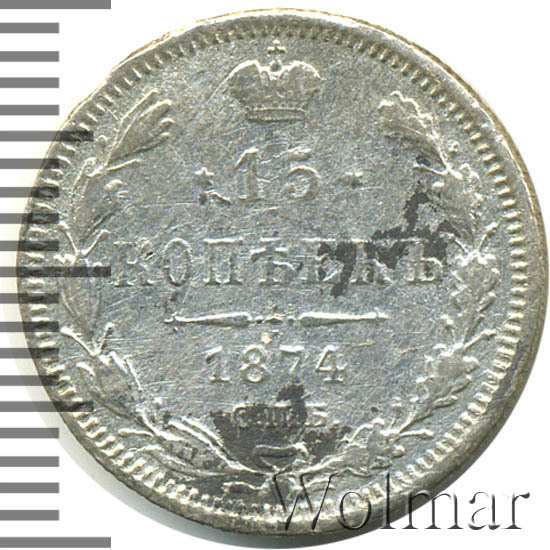 В центре указан номинал - «15», ограниченный с обеих сторон шестиконечными звездочками. Над цифрой – Корона Российской империи. Под цифрой номинала — слово "КОПЕЕК". Ниже, расположен декоративный разделитель в виде двух разнонаправленных фигурных линий и стилизованным из точек крестом между ними. Под разделителем — дата выпуска монеты «1874». Под цифрой даты — обозначение монетного двора «С.П.Б.». Вдоль канта, не доходя до короны, изображен венок из лавровой и дубовой ветви, которые, в нижней части, перевязаны лентой на узел бантом. По окружности канта имеются рельефные элементы, выполненные в виде зубцов.