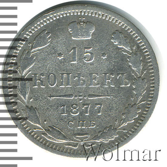 В центре указан номинал - «15», ограниченный с обеих сторон шестиконечными звездочками. Над цифрой – Корона Российской империи. Под цифрой номинала — слово "КОПЕЕК". Ниже, расположен декоративный разделитель в виде двух разнонаправленных фигурных линий и стилизованным из точек крестом между ними. Под разделителем — дата выпуска монеты «1877». Под цифрой даты — обозначение монетного двора «С.П.Б.». Вдоль канта, не доходя до короны, изображен венок из лавровой и дубовой ветви, которые, в нижней части, перевязаны лентой на узел бантом. По окружности канта имеются рельефные элементы, выполненные в виде зубцов.