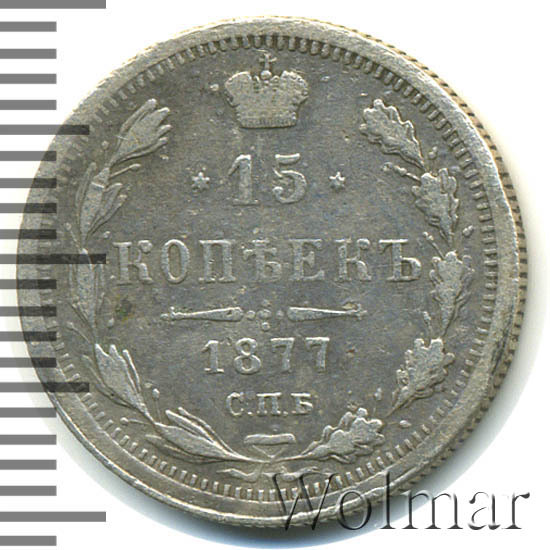 В центре указан номинал - «15», ограниченный с обеих сторон шестиконечными звездочками. Над цифрой – Корона Российской империи. Под цифрой номинала — слово "КОПЕЕК". Ниже, расположен декоративный разделитель в виде двух разнонаправленных фигурных линий и стилизованным из точек крестом между ними. Под разделителем — дата выпуска монеты «1877». Под цифрой даты — обозначение монетного двора «С.П.Б.». Вдоль канта, не доходя до короны, изображен венок из лавровой и дубовой ветви, которые, в нижней части, перевязаны лентой на узел бантом. По окружности канта имеются рельефные элементы, выполненные в виде зубцов.