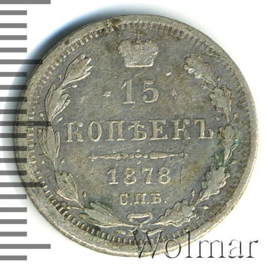 В центре указан номинал - «15», ограниченный с обеих сторон шестиконечными звездочками. Над цифрой – Корона Российской империи. Под цифрой номинала — слово "КОПЕЕК". Ниже, расположен декоративный разделитель в виде двух разнонаправленных фигурных линий и стилизованным из точек крестом между ними. Под разделителем — дата выпуска монеты «1878». Под цифрой даты — обозначение монетного двора «С.П.Б.». Вдоль канта, не доходя до короны, изображен венок из лавровой и дубовой ветви, которые, в нижней части, перевязаны лентой на узел бантом. По окружности канта имеются рельефные элементы, выполненные в виде зубцов.
