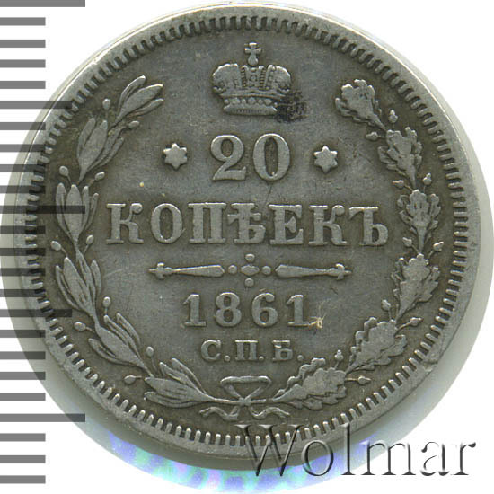 В центре указан номинал «20», ограниченный с обеих сторон шестиконечными звездочками. Над цифрой – Корона Российской империи. Под цифрой номинала — слово "КОПЕЕК". Ниже, расположен декоративный разделитель в виде двух разнонаправленных фигурных линий и стилизованным из точек крестом между ними. Под разделителем — дата выпуска монеты «1861». Под цифрой даты — обозначение монетного двора «С.П.Б.». Вдоль канта, не доходя до короны, изображен венок из лавровой и дубовой ветви, которые в нижней части перевязаны лентой на узел бантом. По окружности канта имеются рельефные элементы, выполненные в виде зубцов.