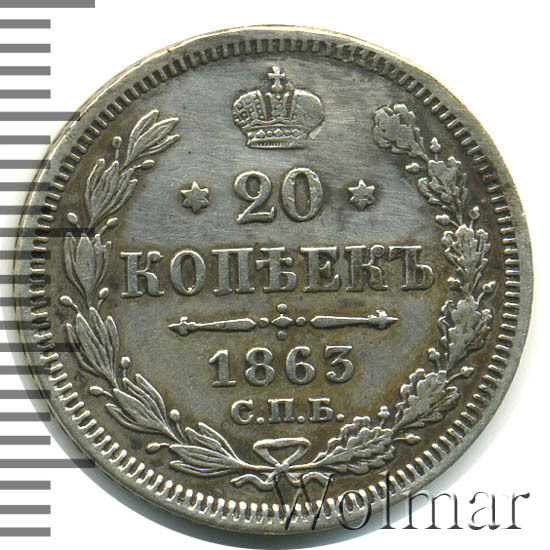 В центре указан номинал «20», ограниченный с обеих сторон шестиконечными звездочками. Над цифрой – Корона Российской империи. Под цифрой номинала — слово "КОПЕЕК". Ниже, расположен декоративный разделитель в виде двух разнонаправленных фигурных линий и стилизованным из точек крестом между ними. Под разделителем — дата выпуска монеты «1863». Под цифрой даты — обозначение монетного двора «С.П.Б.». Вдоль канта, не доходя до короны, изображен венок из лавровой и дубовой ветви, которые в нижней части перевязаны лентой на узел бантом. По окружности канта имеются рельефные элементы, выполненные в виде зубцов.