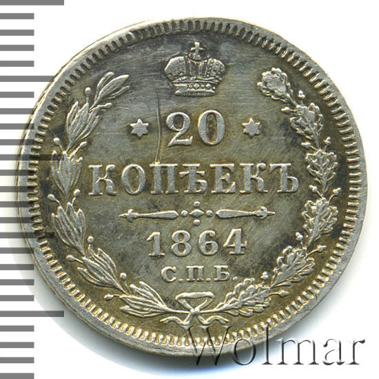 В центре указан номинал «20», ограниченный с обеих сторон шестиконечными звездочками. Над цифрой – Корона Российской империи. Под цифрой номинала — слово "КОПЕЕК". Ниже, расположен декоративный разделитель в виде двух разнонаправленных фигурных линий и стилизованным из точек крестом между ними. Под разделителем — дата выпуска монеты «1864». Под цифрой даты — обозначение монетного двора «С.П.Б.». Вдоль канта, не доходя до короны, изображен венок из лавровой и дубовой ветви, которые в нижней части перевязаны лентой на узел бантом. По окружности канта имеются рельефные элементы, выполненные в виде зубцов.