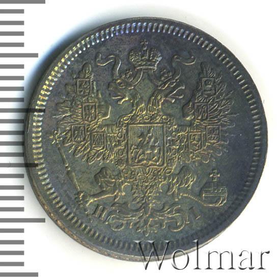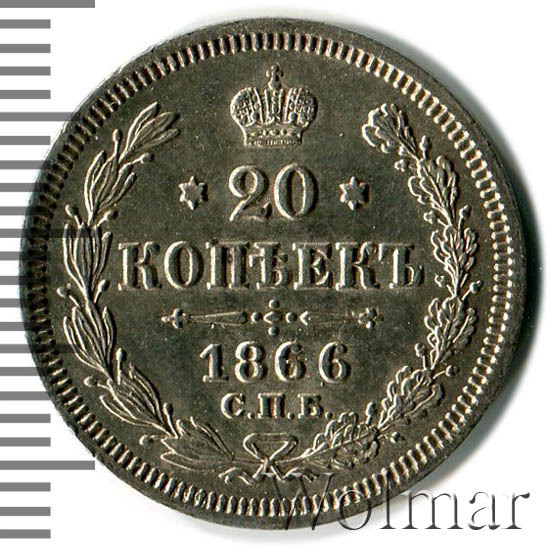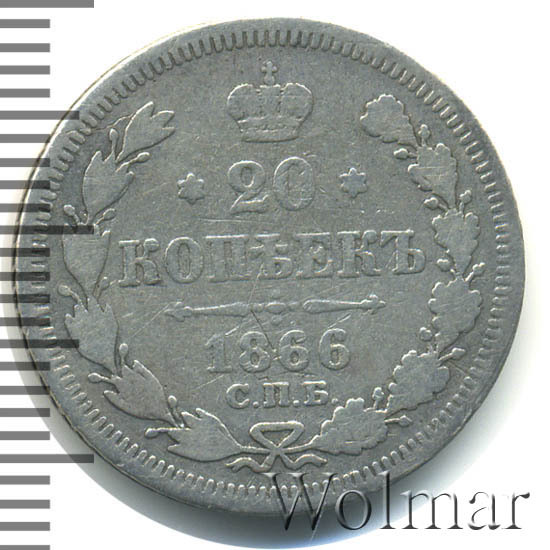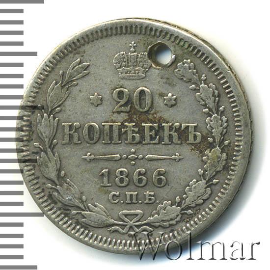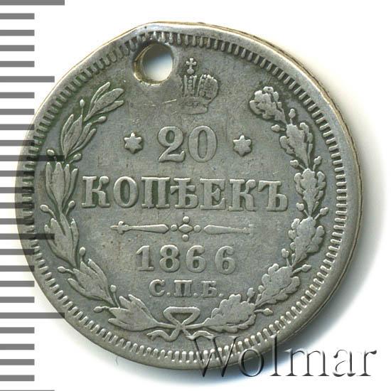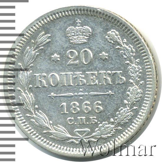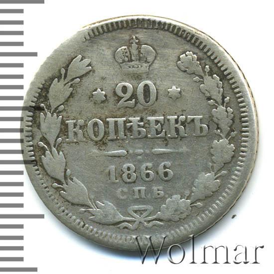 В центре указан номинал «20», ограниченный с обеих сторон шестиконечными звездочками. Над цифрой – Корона Российской империи. Под цифрой номинала — слово "КОПЕЕК". Ниже, расположен декоративный разделитель в виде двух разнонаправленных фигурных линий и стилизованным из точек крестом между ними. Под разделителем — дата выпуска монеты «1866». Под цифрой даты — обозначение монетного двора «С.П.Б.». Вдоль канта, не доходя до короны, изображен венок из лавровой и дубовой ветви, которые в нижней части перевязаны лентой на узел бантом. По окружности канта имеются рельефные элементы, выполненные в виде зубцов.