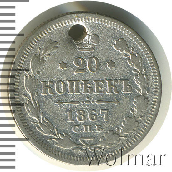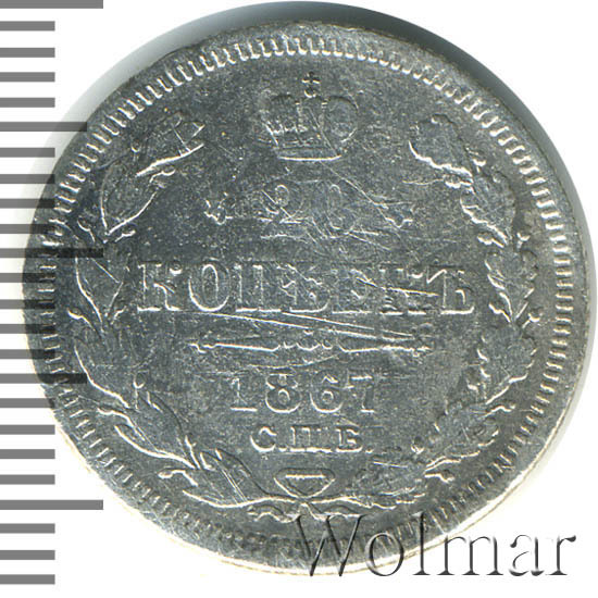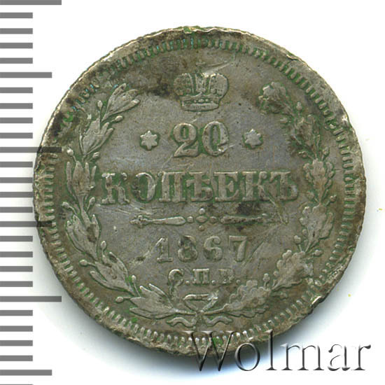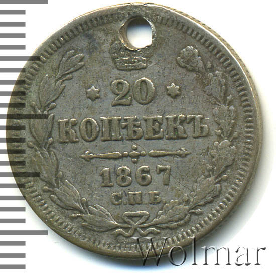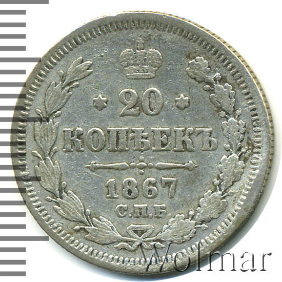 В центре указан номинал - «20», ограниченный с обеих сторон шестиконечными звездочками. Над цифрой – Корона Российской империи. Под цифрой номинала — слово "КОПЕЕК". Ниже, расположен декоративный разделитель в виде двух разнонаправленных фигурных линий и стилизованным из точек крестом между ними. Под разделителем — дата выпуска монеты «1867». Под цифрой даты — обозначение монетного двора «С.П.Б.». Вдоль канта, не доходя до короны, изображен венок из лавровой и дубовой ветви, которые, в нижней части, перевязаны лентой на узел бантом. По окружности канта имеются рельефные элементы, выполненные в виде зубцов.