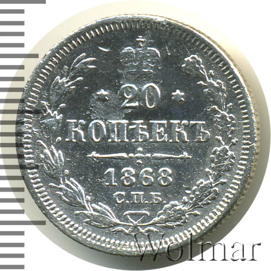 В центре указан номинал - «20», ограниченный с обеих сторон шестиконечными звездочками. Над цифрой – Корона Российской империи. Под цифрой номинала — слово "КОПЕЕК". Ниже, расположен декоративный разделитель в виде двух разнонаправленных фигурных линий и стилизованным из точек крестом между ними. Под разделителем — дата выпуска монеты «1868». Под цифрой даты — обозначение монетного двора «С.П.Б.». Вдоль канта, не доходя до короны, изображен венок из лавровой и дубовой ветви, которые, в нижней части, перевязаны лентой на узел бантом. По окружности канта имеются рельефные элементы, выполненные в виде зубцов.