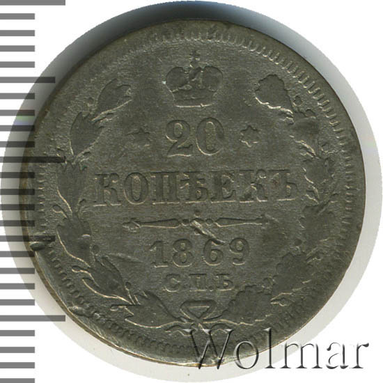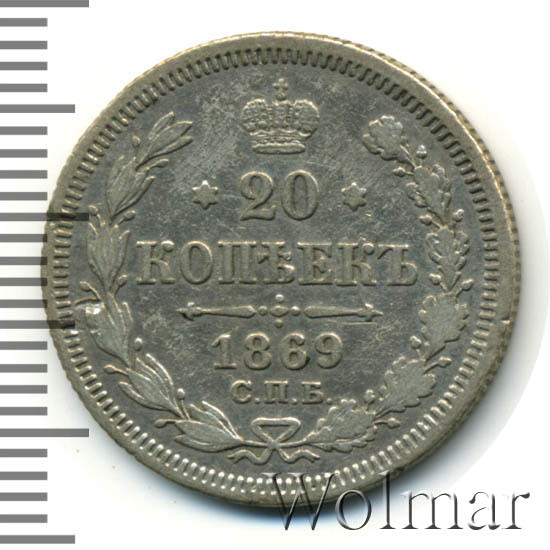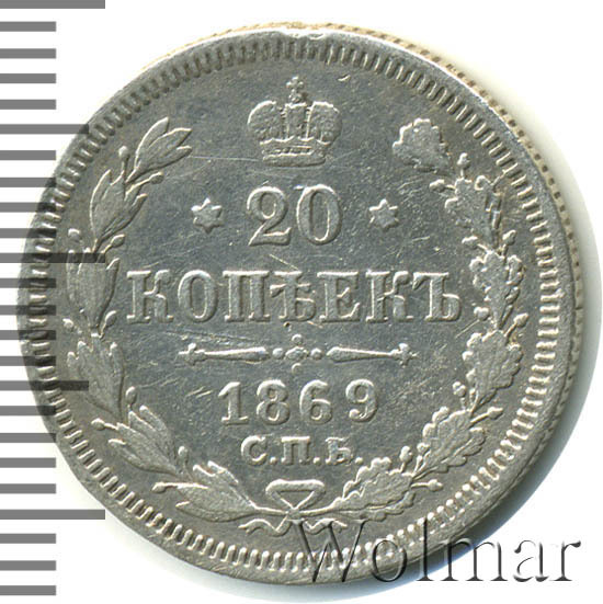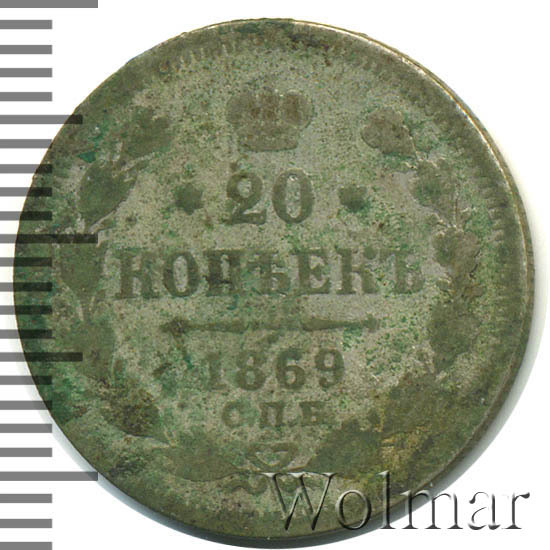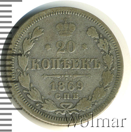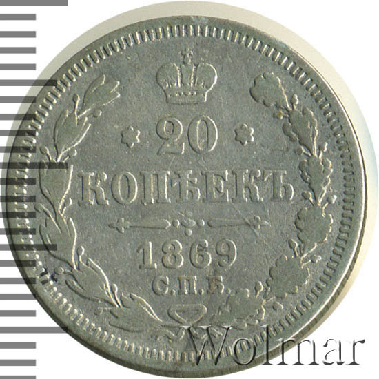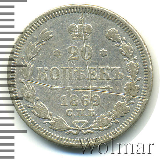 В центре указан номинал - «20», ограниченный с обеих сторон шестиконечными звездочками. Над цифрой – Корона Российской империи. Под цифрой номинала — слово "КОПЕЕК". Ниже, расположен декоративный разделитель в виде двух разнонаправленных фигурных линий и стилизованным из точек крестом между ними. Под разделителем — дата выпуска монеты «1869». Под цифрой даты — обозначение монетного двора «С.П.Б.». Вдоль канта, не доходя до короны, изображен венок из лавровой и дубовой ветви, которые, в нижней части, перевязаны лентой на узел бантом. По окружности канта имеются рельефные элементы, выполненные в виде зубцов.