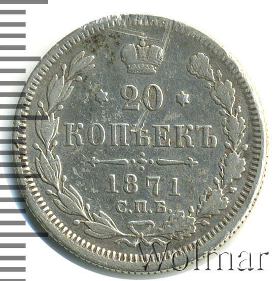 В центре указан номинал - «20», ограниченный с обеих сторон шестиконечными звездочками. Над цифрой – Корона Российской империи. Под цифрой номинала — слово "КОПЕЕК". Ниже, расположен декоративный разделитель в виде двух разнонаправленных фигурных линий и стилизованным из точек крестом между ними. Под разделителем — дата выпуска монеты «1871». Под цифрой даты — обозначение монетного двора «С.П.Б.». Вдоль канта, не доходя до короны, изображен венок из лавровой и дубовой ветви, которые, в нижней части, перевязаны лентой на узел бантом. По окружности канта имеются рельефные элементы, выполненные в виде зубцов.