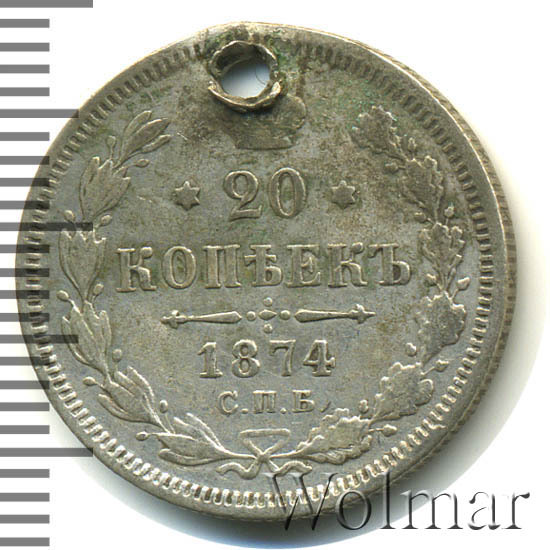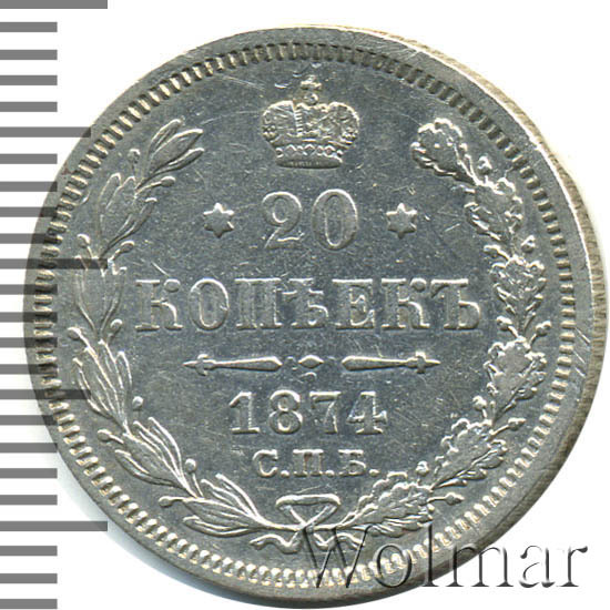 В центре указан номинал - «20», ограниченный с обеих сторон шестиконечными звездочками. Над цифрой – Корона Российской империи. Под цифрой номинала — слово "КОПЕЕК". Ниже, расположен декоративный разделитель в виде двух разнонаправленных фигурных линий и стилизованным из точек крестом между ними. Под разделителем — дата выпуска монеты «1874». Под цифрой даты — обозначение монетного двора «С.П.Б.». Вдоль канта, не доходя до короны, изображен венок из лавровой и дубовой ветви, которые, в нижней части, перевязаны лентой на узел бантом. По окружности канта имеются рельефные элементы, выполненные в виде зубцов.