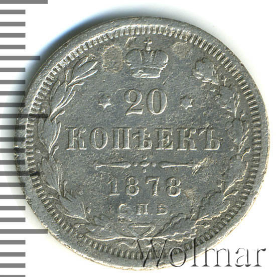 В центре указан номинал - «20», ограниченный с обеих сторон шестиконечными звездочками. Над цифрой – Корона Российской империи. Под цифрой номинала — слово "КОПЕЕК". Ниже, расположен декоративный разделитель в виде двух разнонаправленных фигурных линий и стилизованным из точек крестом между ними. Под разделителем — дата выпуска монеты «1878». Под цифрой даты — обозначение монетного двора «С.П.Б.». Вдоль канта, не доходя до короны, изображен венок из лавровой и дубовой ветви, которые, в нижней части, перевязаны лентой на узел бантом. По окружности канта имеются рельефные элементы, выполненные в виде зубцов.