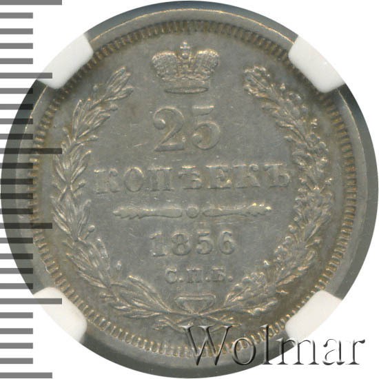 В центре указан номинал «25». Над цифрой – Корона Российской империи. Под цифрой номинала — слово "КОПЕЕК". Ниже, расположен декоративный разделитель в виде двух разнонаправленных фигурных линий и небольшой окружности между ними, в центре которой, выпуклая точка. Под разделителем — дата выпуска монеты «1856». Под цифрой даты — обозначение монетного двора «С.П.Б.». Вдоль канта, не доходя до короны, изображен венок из лавровой и дубовой ветви, которые в нижней части перевязаны лентой на узел бантом. По окружности канта имеются рельефные элементы, выполненные в виде зубцов.
