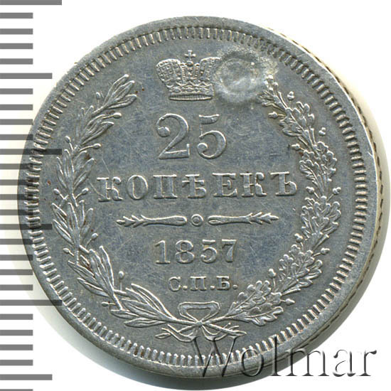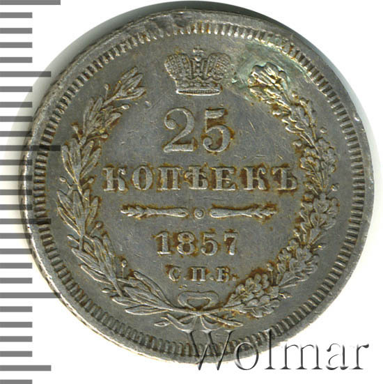В центре указан номинал «25». Над цифрой – Корона Российской империи. Под цифрой номинала — слово "КОПЕЕК". Ниже, расположен декоративный разделитель в виде двух разнонаправленных фигурных линий и небольшой окружности между ними, в центре которой, выпуклая точка. Под разделителем — дата выпуска монеты «1857». Под цифрой даты — обозначение монетного двора «С.П.Б.». Вдоль канта, не доходя до короны, изображен венок из лавровой и дубовой ветви, которые в нижней части перевязаны лентой на узел бантом. По окружности канта имеются рельефные элементы, выполненные в виде зубцов.