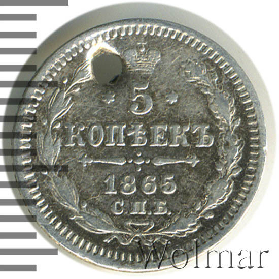 В центре указан номинал «5», ограниченный с обеих сторон шестиконечными звездочками. Над цифрой – Корона Российской империи. Под цифрой номинала — слово "КОПЕЕК". Ниже, расположен декоративный разделитель в виде двух разнонаправленных фигурных линий и стилизованным из точек крестом между ними. Под разделителем — дата выпуска монеты «1865». Под цифрой даты — обозначение монетного двора «С.П.Б.». Вдоль канта, не доходя до короны, изображен венок из лавровой и дубовой ветви, которые в нижней части перевязаны лентой на узел бантом. По окружности канта имеются рельефные элементы, выполненные в виде зубцов.