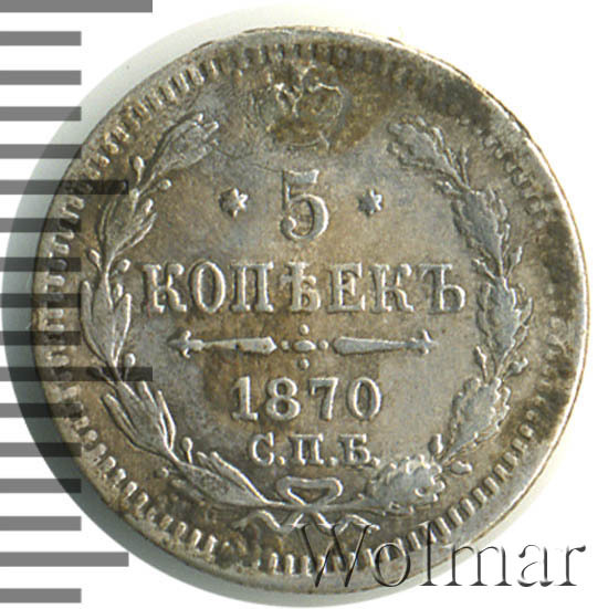 В центре указан номинал - «5», ограниченный с обеих сторон шестиконечными звездочками. Над цифрой – Корона Российской империи. Под цифрой номинала — слово "КОПЕЕК". Ниже, расположен декоративный разделитель в виде двух разнонаправленных фигурных линий и стилизованным из точек крестом между ними. Под разделителем — дата выпуска монеты «1870». Под цифрой даты — обозначение монетного двора «С.П.Б.». Вдоль канта, не доходя до короны, изображен венок из лавровой и дубовой ветви, которые, в нижней части, перевязаны лентой на узел бантом. По окружности канта имеются рельефные элементы, выполненные в виде зубцов.