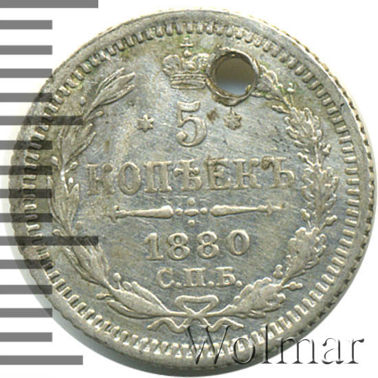 В центре указан номинал - «5», ограниченный с обеих сторон шестиконечными звездочками. Над цифрой – Корона Российской империи. Под цифрой номинала — слово "КОПЕЕК". Ниже, расположен декоративный разделитель в виде двух разнонаправленных фигурных линий и стилизованным из точек крестом между ними. Под разделителем — дата выпуска монеты «1880». Под цифрой даты — обозначение монетного двора «С.П.Б.». Вдоль канта, не доходя до короны, изображен венок из лавровой и дубовой ветви, которые, в нижней части, перевязаны лентой на узел бантом. По окружности канта имеются рельефные элементы, выполненные в виде зубцов.