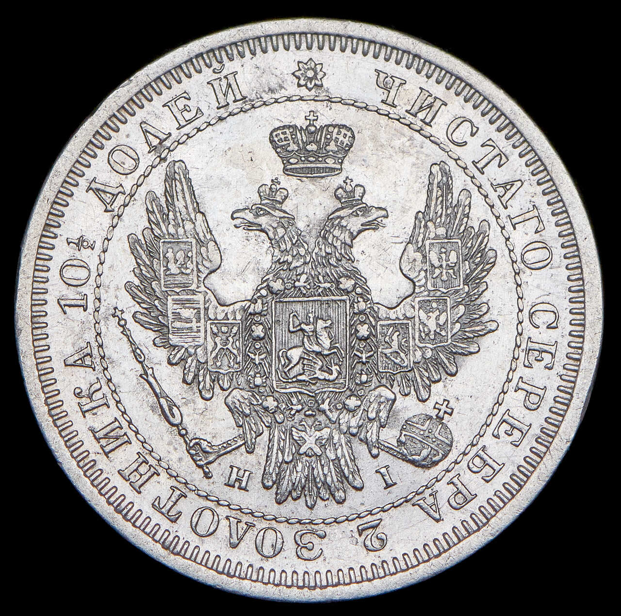 В центре изображен Государственный Герб Российской империи - двуглавый орёл, головы которого увенчаны двумя коронами, третья, большая корона над ними. На груди орла расположен Московский герб - щит с изображением Георгия Победоносца, поражающего копьем дракона. Вокруг щита орденская цепь с орденом Св. Апостола Андрея Первозванного. На крыльях изображены титульные гербы: на правом — Казанский, Астраханский и Сибирский, на левом — Польский, Таврический и Финляндский. В правой лапе орла – скипетр, в левой – держава. Под правой лапой – буква «Н», под левой – буква «I». Инициалы минцмейстера Николая Иоссы. Центральная часть отделена от остального изображения, окружностью в виде точек. За окружностью круговая надпись: «ЧИСТОГО СЕРЕБРА 2 ЗОЛОТНИКА 10 1/2 ДОЛЕЙ», разделенная сверху цветочной розеткой. По окружности канта имеются рельефные элементы, выполненные в виде зубцов.