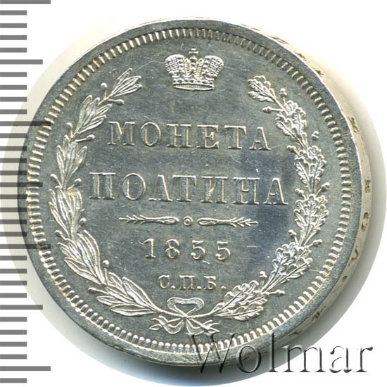 В центре указан номинал «МОНЕТА ПОЛТИНА» в две строки. Над номиналом – Корона Российской империи. Под номиналом расположен декоративный разделитель в виде двух разнонаправленных фигурных линий и небольшой окружности между ними, в центре которой, выпуклая точка. Под разделителем — дата выпуска монеты «1855». Под цифрой даты — обозначение монетного двора «С.П.Б.». Вдоль канта, не доходя до короны, изображен венок из лавровой и дубовой ветви, которые в нижней части перевязаны лентой на узел бантом. По окружности канта имеются рельефные элементы, выполненные в виде зубцов.