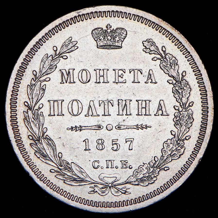 В центре указан номинал «МОНЕТА ПОЛТИНА» в две строки. Над номиналом – Корона Российской империи. Под номиналом расположен декоративный разделитель в виде двух разнонаправленных фигурных линий и небольшой окружности между ними, в центре которой, выпуклая точка. Под разделителем — дата выпуска монеты «1857». Под цифрой даты — обозначение монетного двора «С.П.Б.». Вдоль канта, не доходя до короны, изображен венок из лавровой и дубовой ветви, которые в нижней части перевязаны лентой на узел бантом. По окружности канта имеются рельефные элементы, выполненные в виде зубцов.