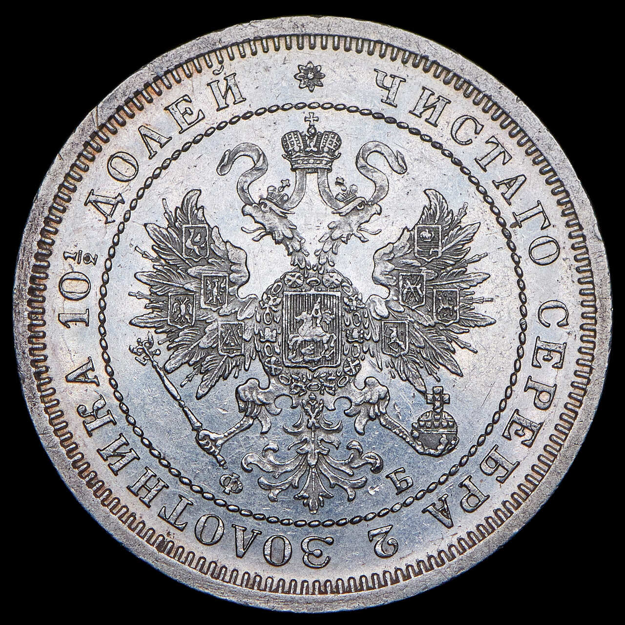 В центре изображен Малый Государственный Герб Российской империи - двуглавый орёл, головы которого увенчаны двумя коронами, третья, большая корона над ними. Все они соединены орденской лентой ордена Св. Апостола Андрея Первозванного. На груди орла расположен Московский герб - щит с изображением Георгия Победоносца с копьём, поражающий дракона. Вокруг щита цепь ордена Св. Апостола Андрея Первозванного. На крыльях изображены гербы: Царства Казанского, Польского, Херсонеса Таврического, Астраханского, Сибирского, Грузинского и герб соединенных княжеств Киевского, Новгородского и Владимирского — по 4 на каждое крыло. В правой лапе орла – скипетр, в левой – держава. Под правой лапой – буква «Ф», под левой – буква «Б». Инициалы минцмейстера Федора Блюма. Центральная часть отделена от остального изображения, витой точечной окружностью. За окружностью круговая надпись: «ЧИСТАГО СЕРЕБРА 2 ЗОЛОТНИКА 10 1/2 ДОЛЕЙ», разделенная сверху цветочной розеткой. По окружности канта имеются рельефные элементы, выполненные в виде зубцов.